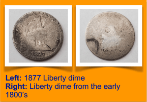 One of the dimes is an 1877 Liberty dime and the other coin is so worn that it’s hard to determine the exact date but I’m reasonably certain it’s a Liberty dime from the early 1800’s.